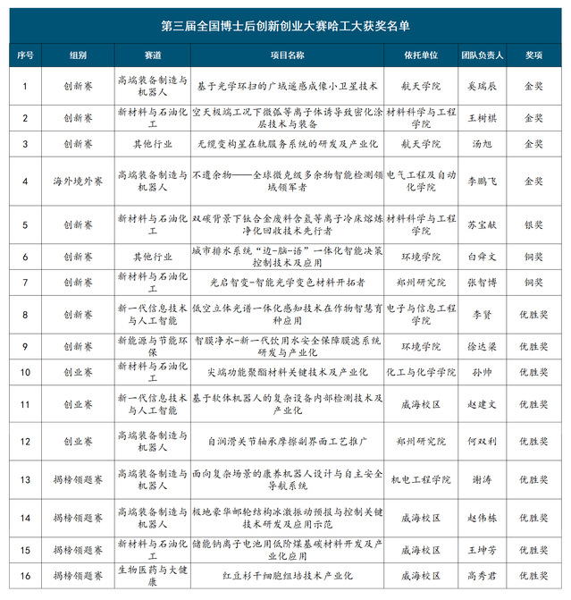 【转载哈工大全媒体消息】第三届全国博士后创新创业大赛总决赛在福建泉州举行。哈工大参赛博士后团队凭借扎实的科研功底和卓越的创新能力,在众多高水平项目中脱颖而出,最终斩获4金1银2铜及9项优胜奖,获奖项目覆盖全部组别与多个赛道,获得金奖数量位居参赛队伍前列,创造哈工大参加该项赛事以来的历史最好成绩,充分展现了哈工大博士后人才的创新活力与创业潜能。我所王树棋领衔的“空天极端工况下微弧等离子体诱导致密化涂层技术与装备”项目获得金奖。